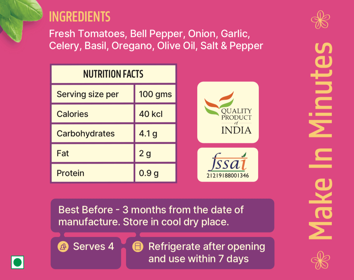 Ingredients : Fresh Tomatoes, Onions, Garlic, Red capsicum, Olive Oil, Salt, Pepper, Celery, Basil, Oregano.