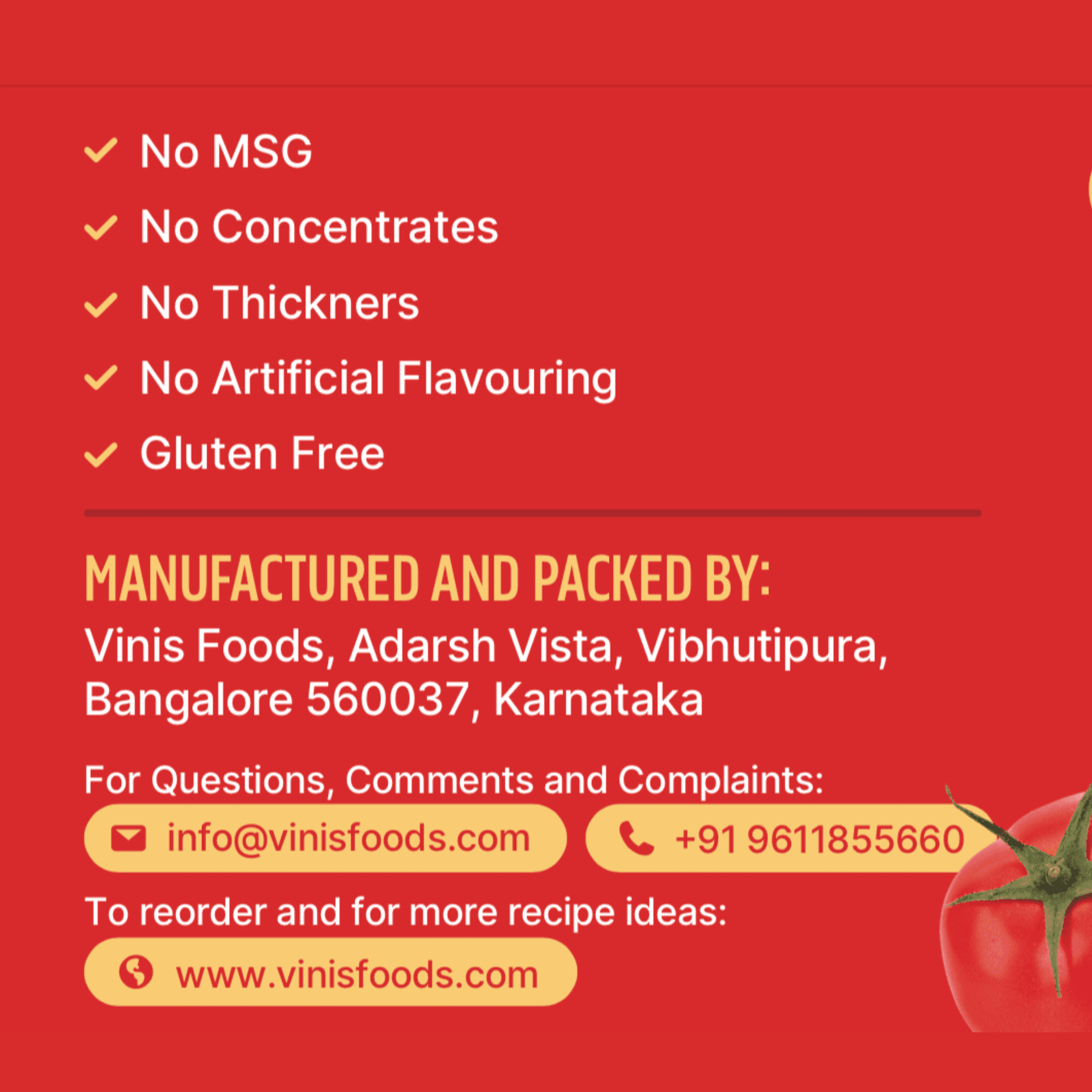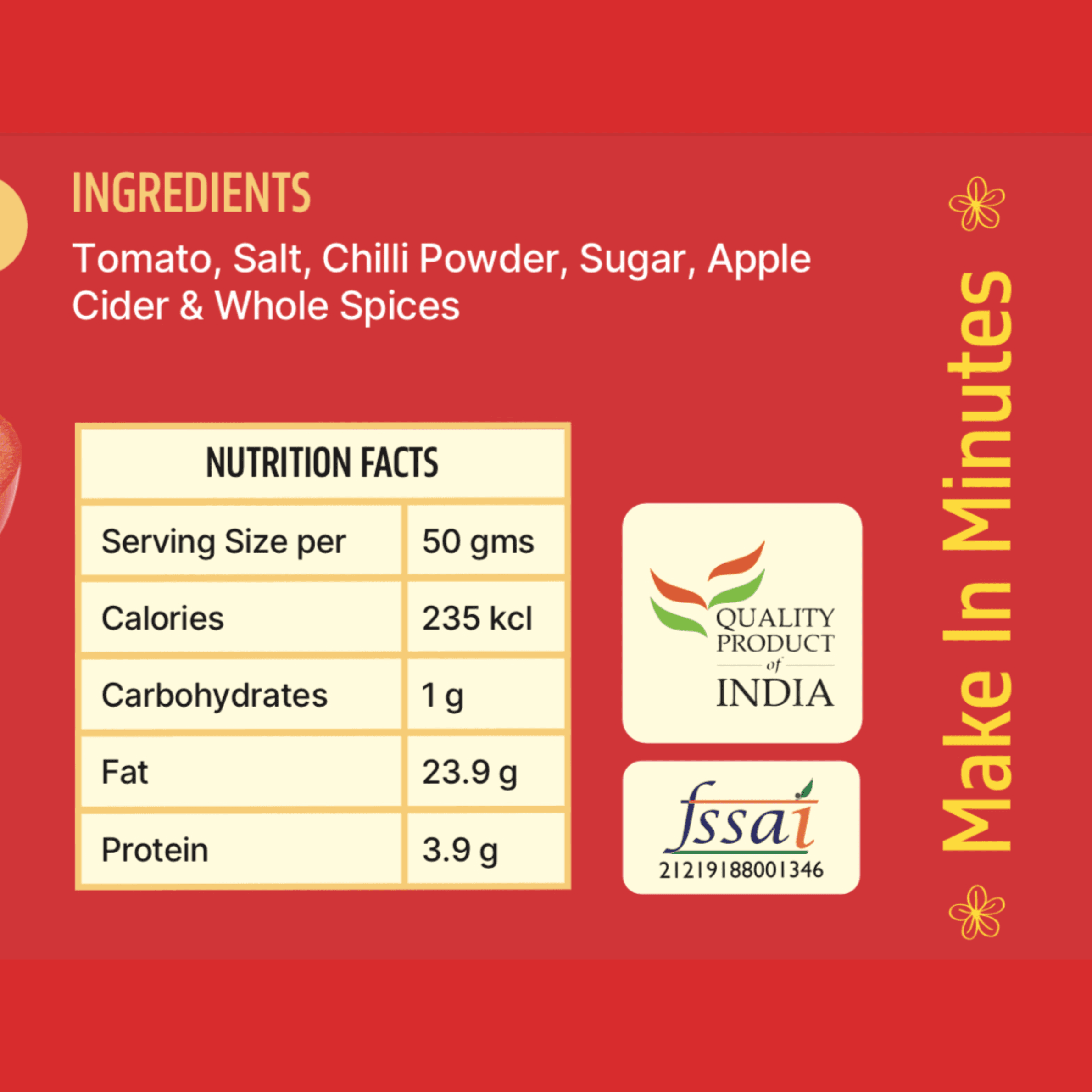 Ingredients : Fresh Tomatoes, Salt, Sugar, Mixed Spices, Apple cider Vinegar
