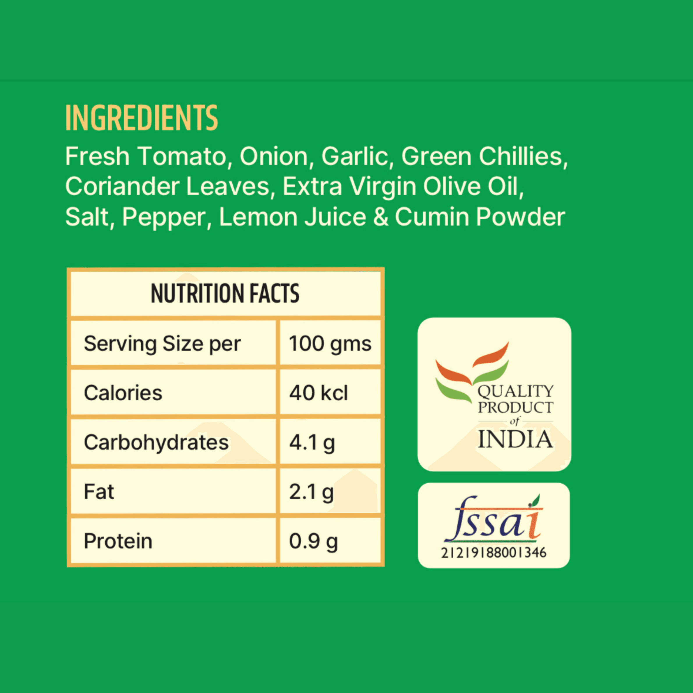 Ingredients : Fresh Tomatoes, Chilli, Garlic, Olive oil, Coriander, Cumin, Salt, Pepper, Lemon Juice.