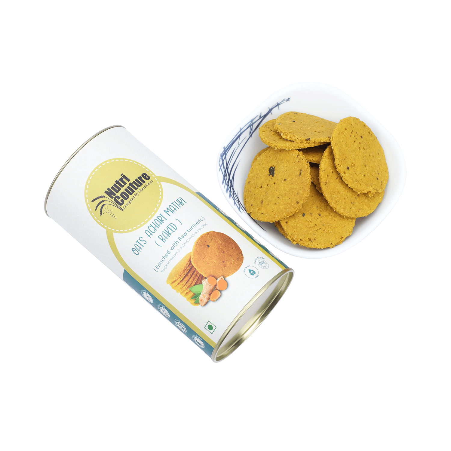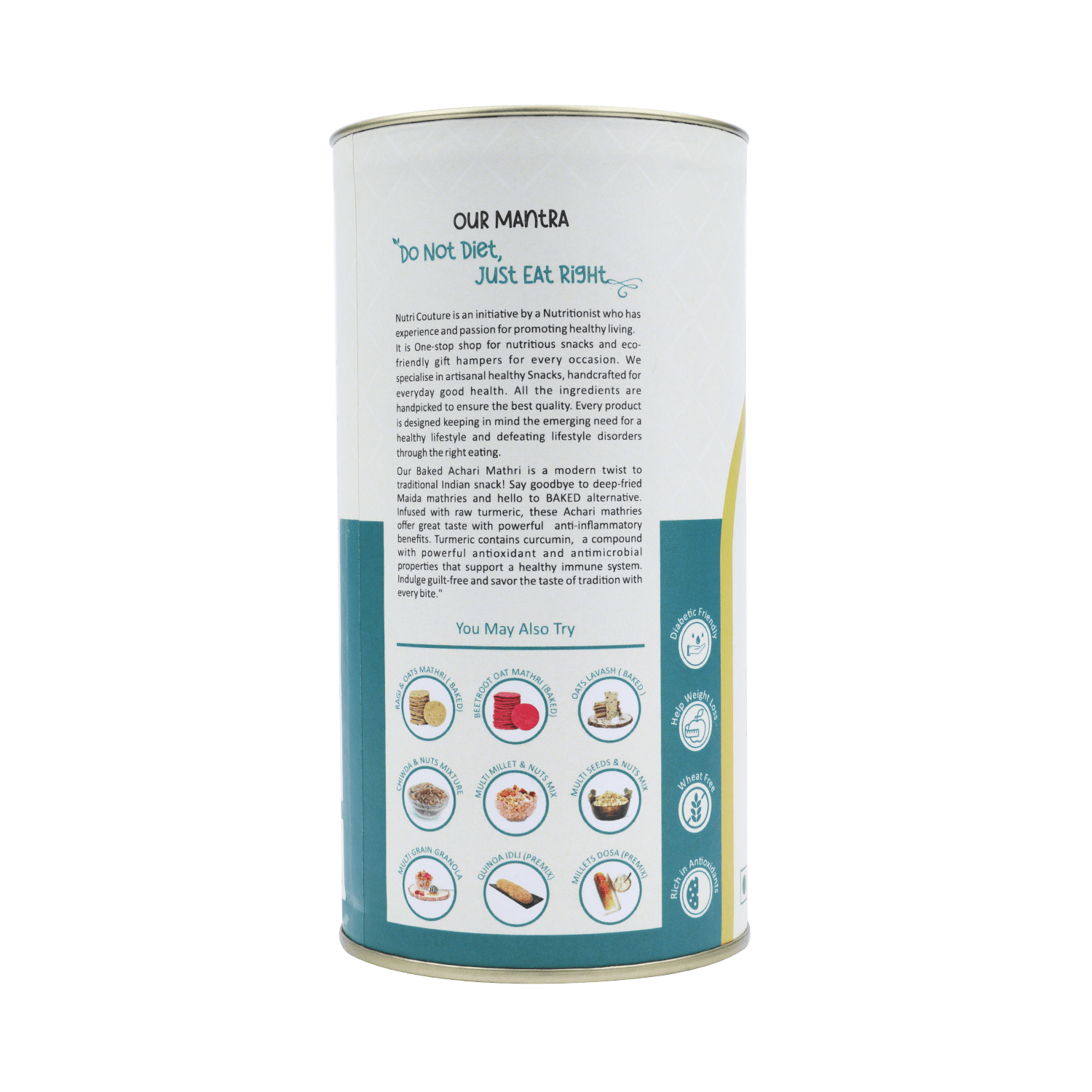 A nutritious twist to a traditional favorite β our Achari Mathri is made with a nourishing blend of Oats and Sorghum, gently baked (not fried!) in heart-healthy Extra Virgin Olive Oil. Infused with Indian spices and authentic achari masala, this snack is not just flavorful β it's functional.