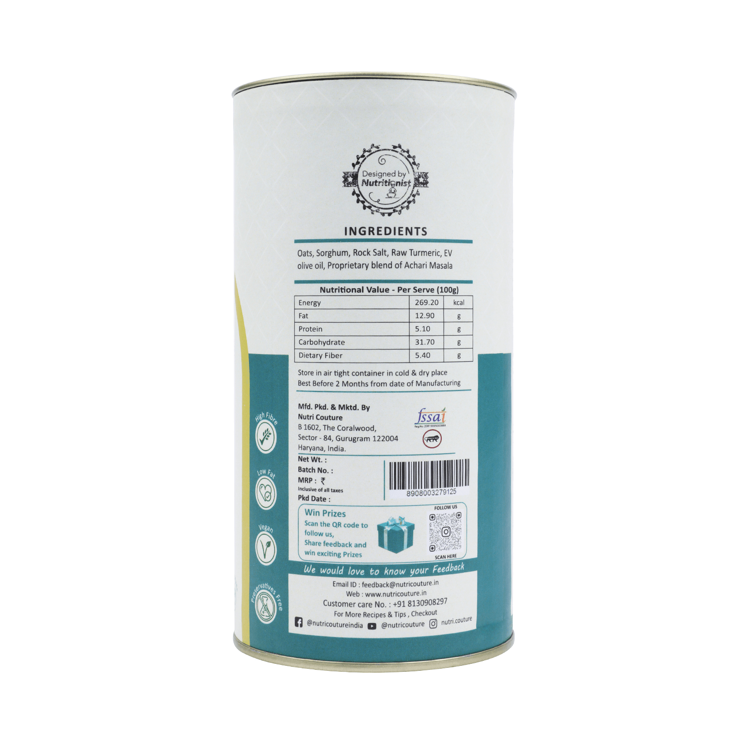 Oats, sorghum, Raw turmeric, Achari masala, indian spices, Extra Virgin(EV) olive oil, rock salt,
