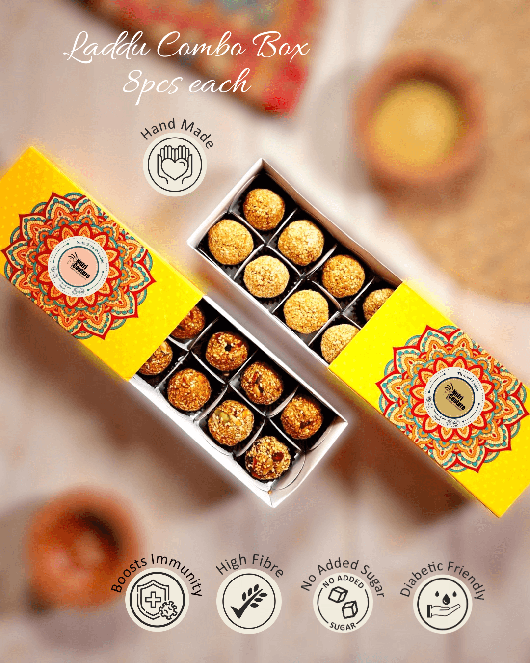 This Nutri Couture Laddu Combo Pack brings together two festive favourites—traditional Til-Gud laddus and nourishing Nuts & Seeds laddus.
