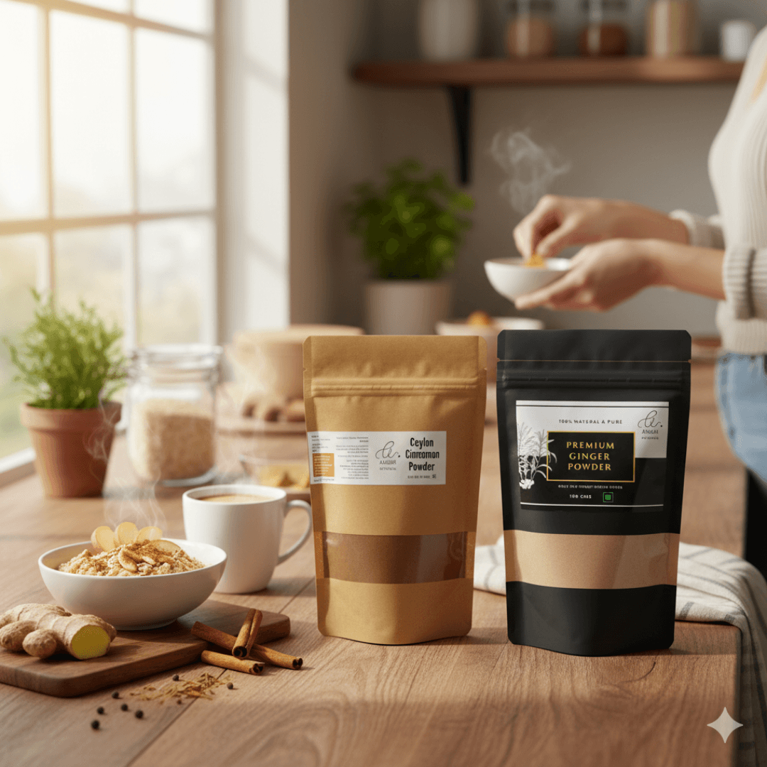 Double the Flavour. Double the Benefits. Upgrade your pantry with our premium spice pairing. We’ve combined the delicate, sweet warmth of True Ceylon Cinnamon with the zesty, digestive fire of Pure Ginger Powder. Together, they are the ultimate toolkit for daily wellness and gourmet cooking.