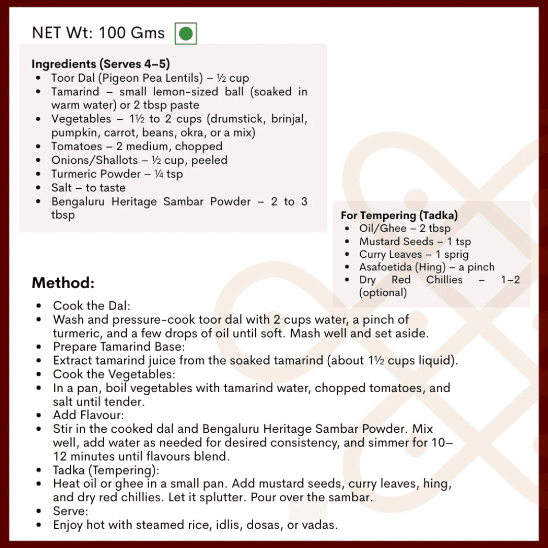 Use the Bengaluru Heritage Sambar Powder to prepare traditional sambar, rasam-style gravies, vegetable curries, or to add depth to lentils and stews.