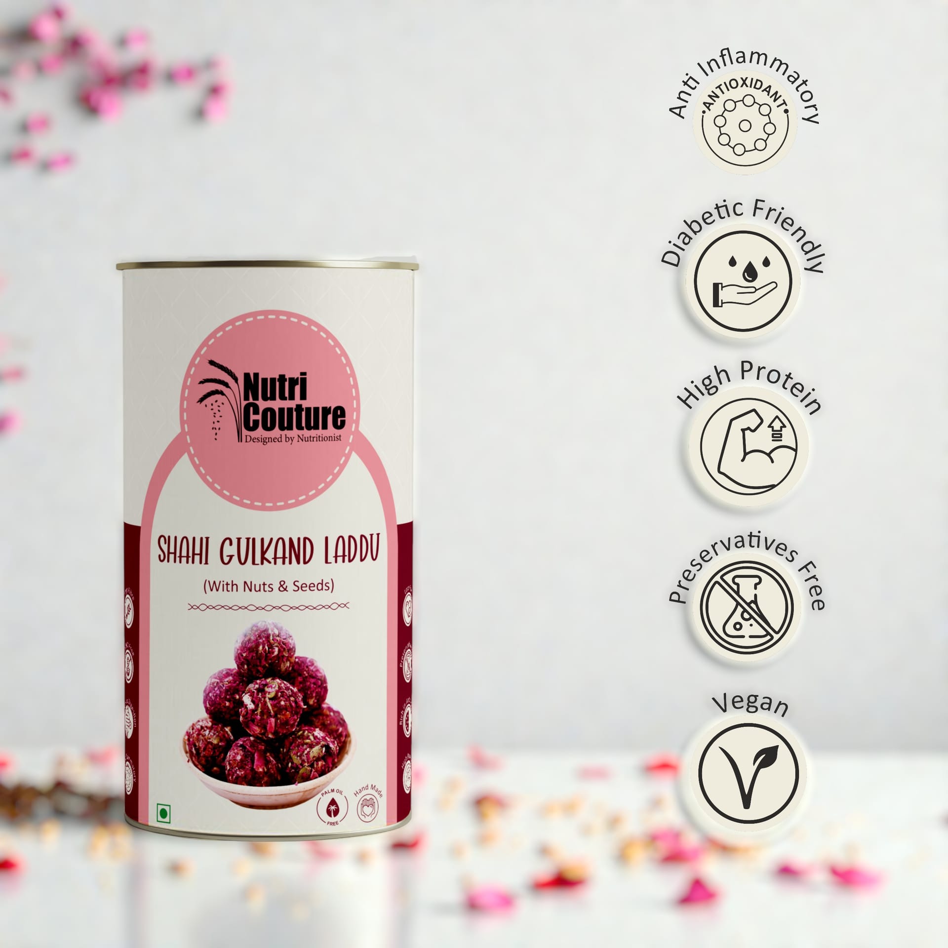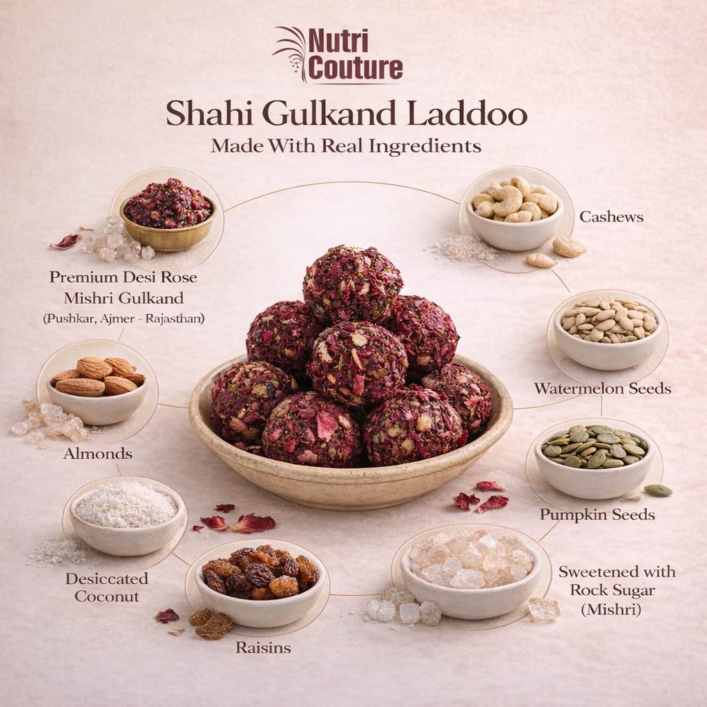 {"type":"doc","content":[{"type":"heading","attrs":{"textAlign":null,"level":2},"content":[{"type":"text","marks":[{"type":"bold"}],"text":"Product Description"}]},{"type":"paragraph","attrs":{"textAlign":null},"content":[{"type":"text","text":"Nutri Couture’s "},{"type":"text","marks":[{"type":"bold"}],"text":"Shahi Gulkand Laddu"},{"type":"text","text":" is a royal indulgence inspired by India’s rich mithai heritage and crafted for the mindful modern palate. At its heart lies premium desi rose gulkand sourced from Pushkar (Ajmer, Rajasthan), known for its fragrant roses and traditional preparation methods. Sweetened naturally with rock sugar (mishri) and blended with nutrient-dense nuts and seeds, this laddu delivers a delicate floral sweetness balanced with richness and texture."}]},{"type":"paragraph","attrs":{"textAlign":null},"content":[{"type":"text","text":"Made with almonds, cashews, watermelon and pumpkin seeds, desiccated coconut, raisins, and aromatic rose petals, every bite offers indulgence without compromise. There is no refined sugar, no refined oils, no preservatives, and absolutely no trans fats. "}]},{"type":"paragraph","attrs":{"textAlign":null},"content":[{"type":"text","text":"At "},{"type":"text","marks":[{"type":"bold"}],"text":"Nutri Couture, we believe sweets should nourish the body as much as they delight the senses — and this Shahi Gulkand Laddu is a celebration of purity, tradition, and functional nutrition."}]},{"type":"paragraph","attrs":{"textAlign":null},"content":[{"type":"text","text":"Perfect as a festive mithai, a post-meal dessert, or a premium gifting option, it redefines what “guilt-free indulgence” truly means."}]},{"type":"horizontalRule"},{"type":"heading","attrs":{"textAlign":null,"level":3},"content":[{"type":"text","marks":[{"type":"bold"}],"text":"Net Weight / Content:"}]},{"type":"bulletList","content":[{"type":"listItem","content":[{"type":"paragraph","attrs":{"textAlign":null},"content":[{"type":"text","text":"Net Weight: 250g"}]}]},{"type":"listItem","content":[{"type":"paragraph","attrs":{"textAlign":null},"content":[{"type":"text","text":"Approximate Weight per Laddu: 18g"}]}]},{"type":"listItem","content":[{"type":"paragraph","attrs":{"textAlign":null},"content":[{"type":"text","text":"Approximate Pieces per Pack: 13–14 laddus"}]}]},{"type":"listItem","content":[{"type":"paragraph","attrs":{"textAlign":null},"content":[{"type":"text","text":"Form: Ready-to-eat premium nut & gulkand laddu"}]}]}]},{"type":"horizontalRule"},{"type":"heading","attrs":{"textAlign":null,"level":3},"content":[{"type":"text","marks":[{"type":"bold"}],"text":"Ingredients:"}]},{"type":"bulletList","content":[{"type":"listItem","content":[{"type":"paragraph","attrs":{"textAlign":null},"content":[{"type":"text","text":"Almonds"}]}]},{"type":"listItem","content":[{"type":"paragraph","attrs":{"textAlign":null},"content":[{"type":"text","text":"Cashews"}]}]},{"type":"listItem","content":[{"type":"paragraph","attrs":{"textAlign":null},"content":[{"type":"text","text":"Watermelon Seeds"}]}]},{"type":"listItem","content":[{"type":"paragraph","attrs":{"textAlign":null},"content":[{"type":"text","text":"Pumpkin Seeds"}]}]},{"type":"listItem","content":[{"type":"paragraph","attrs":{"textAlign":null},"content":[{"type":"text","text":"Premium Desi Rose Mishri Gulkand (Pushkar, Ajmer – Rajasthan)"}]}]},{"type":"listItem","content":[{"type":"paragraph","attrs":{"textAlign":null},"content":[{"type":"text","text":"Desiccated Coconut"}]}]},{"type":"listItem","content":[{"type":"paragraph","attrs":{"textAlign":null},"content":[{"type":"text","text":"Raisins"}]}]},{"type":"listItem","content":[{"type":"paragraph","attrs":{"textAlign":null},"content":[{"type":"text","text":"Rose Petals"}]}]},{"type":"listItem","content":[{"type":"paragraph","attrs":{"textAlign":null},"content":[{"type":"text","text":"Sweetened with Rock Sugar (Mishri)"}]}]},{"type":"listItem","content":[{"type":"paragraph","attrs":{"textAlign":null},"content":[{"type":"text","text":"No Refined Sugar"}]}]}]},{"type":"horizontalRule"},{"type":"heading","attrs":{"textAlign":null,"level":3},"content":[{"type":"text","marks":[{"type":"bold"}],"text":"How to Use / Consume:"}]},{"type":"bulletList","content":[{"type":"listItem","content":[{"type":"paragraph","attrs":{"textAlign":null},"content":[{"type":"text","text":"Ready to eat"}]}]},{"type":"listItem","content":[{"type":"paragraph","attrs":{"textAlign":null},"content":[{"type":"text","text":"Enjoy as a mid-meal nourishing snack"}]}]},{"type":"listItem","content":[{"type":"paragraph","attrs":{"textAlign":null},"content":[{"type":"text","text":"Serve as festive mithai during celebrations"}]}]},{"type":"listItem","content":[{"type":"paragraph","attrs":{"textAlign":null},"content":[{"type":"text","text":"Pair with warm milk or herbal tea"}]}]},{"type":"listItem","content":[{"type":"paragraph","attrs":{"textAlign":null},"content":[{"type":"text","text":"Ideal as a natural sweet craving solution"}]}]}]},{"type":"horizontalRule"},{"type":"heading","attrs":{"textAlign":null,"level":3},"content":[{"type":"text","marks":[{"type":"bold"}],"text":"Nutritional Benefits (Per 100g):"}]},{"type":"bulletList","content":[{"type":"listItem","content":[{"type":"paragraph","attrs":{"textAlign":null},"content":[{"type":"text","text":"Energy: 431.4 Kcal"}]}]},{"type":"listItem","content":[{"type":"paragraph","attrs":{"textAlign":null},"content":[{"type":"text","text":"Carbohydrates: 39.8g"}]}]},{"type":"listItem","content":[{"type":"paragraph","attrs":{"textAlign":null},"content":[{"type":"text","text":"Protein: 14.17g – Supports satiety and nourishment"}]}]},{"type":"listItem","content":[{"type":"paragraph","attrs":{"textAlign":null},"content":[{"type":"text","text":"Healthy Fats: 24.93g – From premium nuts & seeds"}]}]},{"type":"listItem","content":[{"type":"paragraph","attrs":{"textAlign":null},"content":[{"type":"text","text":"Dietary Fiber: 9.53g – Supports digestiv