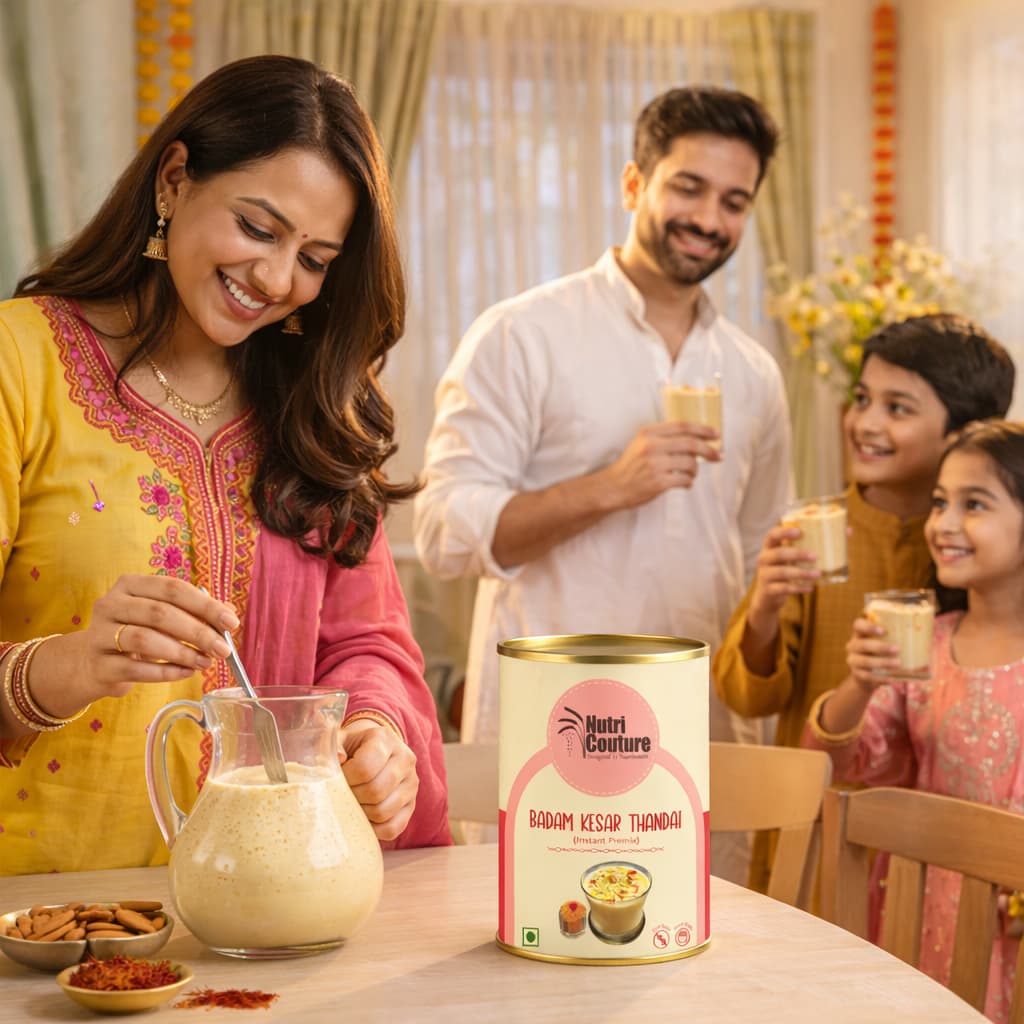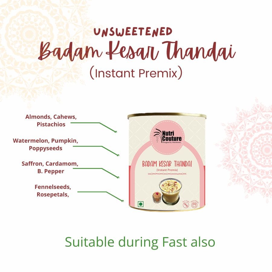 {"type":"doc","content":[{"type":"heading","attrs":{"textAlign":null,"level":2},"content":[{"type":"text","marks":[{"type":"bold"}],"text":"Product Description"}]},{"type":"paragraph","attrs":{"textAlign":null},"content":[{"type":"text","text":"At Nutri Couture, we believe that every sip should nourish the body while honoring tradition. Our "},{"type":"text","marks":[{"type":"bold"}],"text":"Badam Kesar Thandai"},{"type":"text","text":" is a thoughtfully crafted blend inspired by age-old Indian recipes, designed to bring together celebration, wellness, and purity in one glass. Made with an exceptional 86% premium nuts and seeds, this thandai offers a naturally rich, creamy texture and deep, authentic flavor without relying on artificial additives or sugary syrups."}]},{"type":"paragraph","attrs":{"textAlign":null},"content":[{"type":"text","text":"Infused with almonds, cashews, watermelon seeds, pumpkin seeds, pistachios, and poppy seeds, and delicately balanced with fennel, rose petals, black pepper, cardamom, and pure saffron, this blend delivers both indulgence and nourishment. Each ingredient is chosen not just for taste, but for its functional benefits — supporting digestion, sustained energy, and natural cooling during warmer months."}]},{"type":"paragraph","attrs":{"textAlign":null},"content":[{"type":"text","text":"Unlike commercial thandai concentrates loaded with refined sugar and synthetic flavors, Nutri Couture’s blend is completely clean and mindful."}]},{"type":"paragraph","attrs":{"textAlign":null},"content":[{"type":"text","text":"#NoRefined sugar, #NoPreservatives, "}]},{"type":"paragraph","attrs":{"textAlign":null},"content":[{"type":"text","text":"We believe in ingredient integrity , What you get is pure, wholesome nutrition rooted in tradition and backed by conscious formulation."}]},{"type":"paragraph","attrs":{"textAlign":null},"content":[{"type":"text","text":"Whether enjoyed during Holi celebrations, served to guests as a festive welcome drink, or included in your daily summer routine, this "},{"type":"text","marks":[{"type":"bold"}],"text":"Badam Kesar Thandai"},{"type":"text","text":" transforms an ordinary glass of milk into a royal, nourishing experience. It can also be blended into smoothies, plant-based milk, or festive desserts for a rich, aromatic twist."}]},{"type":"paragraph","attrs":{"textAlign":null},"content":[{"type":"text","text":"This is not just a drink mix — it is a celebration of heritage, health, and honest ingredients."}]},{"type":"horizontalRule"},{"type":"heading","attrs":{"textAlign":null,"level":3},"content":[{"type":"text","marks":[{"type":"bold"}],"text":"Net Weight / Content:"}]},{"type":"bulletList","content":[{"type":"listItem","content":[{"type":"paragraph","attrs":{"textAlign":null},"content":[{"type":"text","text":"120g"}]}]},{"type":"listItem","content":[{"type":"paragraph","attrs":{"textAlign":null},"content":[{"type":"text","text":"Form: Premium Thandai Powder Mix"}]}]},{"type":"listItem","content":[{"type":"paragraph","attrs":{"textAlign":null},"content":[{"type":"text","text":"Servings: 25-30g per 200ml"}]}]}]},{"type":"horizontalRule"},{"type":"heading","attrs":{"textAlign":null,"level":3},"content":[{"type":"text","marks":[{"type":"bold"}],"text":"Ingredients:"}]},{"type":"bulletList","content":[{"type":"listItem","content":[{"type":"paragraph","attrs":{"textAlign":null},"content":[{"type":"text","text":"86% Premium Nuts & Seeds Blend:"}]},{"type":"bulletList","content":[{"type":"listItem","content":[{"type":"paragraph","attrs":{"textAlign":null},"content":[{"type":"text","text":"Almonds"}]}]},{"type":"listItem","content":[{"type":"paragraph","attrs":{"textAlign":null},"content":[{"type":"text","text":"Cashews"}]}]},{"type":"listItem","content":[{"type":"paragraph","attrs":{"textAlign":null},"content":[{"type":"text","text":"Watermelon Seeds"}]}]},{"type":"listItem","content":[{"type":"paragraph","attrs":{"textAlign":null},"content":[{"type":"text","text":"Pumpkin Seeds"}]}]},{"type":"listItem","content":[{"type":"paragraph","attrs":{"textAlign":null},"content":[{"type":"text","text":"Pistachios"}]}]},{"type":"listItem","content":[{"type":"paragraph","attrs":{"textAlign":null},"content":[{"type":"text","text":"Poppy Seeds"}]}]}]}]},{"type":"listItem","content":[{"type":"paragraph","attrs":{"textAlign":null},"content":[{"type":"text","text":"Fennel Seeds"}]}]},{"type":"listItem","content":[{"type":"paragraph","attrs":{"textAlign":null},"content":[{"type":"text","text":"Rose Petals"}]}]},{"type":"listItem","content":[{"type":"paragraph","attrs":{"textAlign":null},"content":[{"type":"text","text":"Black Pepper"}]}]},{"type":"listItem","content":[{"type":"paragraph","attrs":{"textAlign":null},"content":[{"type":"text","text":"Cardamom"}]}]},{"type":"listItem","content":[{"type":"paragraph","attrs":{"textAlign":null},"content":[{"type":"text","text":"Pure Saffron (Kesar)"}]}]}]},{"type":"horizontalRule"},{"type":"heading","attrs":{"textAlign":null,"level":2},"content":[{"type":"text","marks":[{"type":"bold"}],"text":"How to Consume:"}]},{"type":"bulletList","content":[{"type":"listItem","content":[{"type":"paragraph","attrs":{"textAlign":null},"content":[{"type":"text","text":"Add 2 tableespoons of thandai powder to chilled or room temperature milk"}]}]},{"type":"listItem","content":[{"type":"paragraph","attrs":{"textAlign":null},"content":[{"type":"text","text":"Stir well or blend for a smoother texture"}]}]},{"type":"listItem","content":[{"type":"paragraph","attrs":{"textAlign":null},"content":[{"type":"text","text":"Add natural sweetener like mishri, raw sugar/ honey, or coconut Sugar."}]}]},{"type":"listItem","content":[{"type":"paragraph","attrs":{"textAlign":null},"content":[{"type":"text","text":"Can also be used in smoothies, milkshakes, lassi, kulfi, or festive desserts"}]}]},{"type":"listItem","content":[{"type":"paragraph","attrs":{"textAlign":null},"content":[{"type":"text","text":"Add to homemade icecreams/ pud