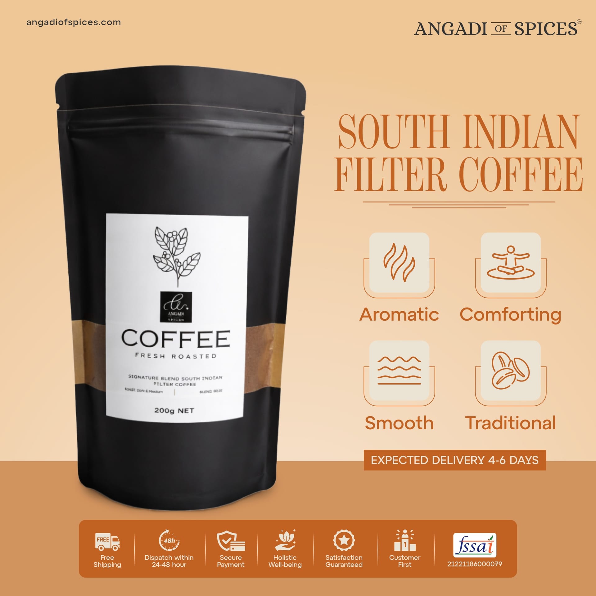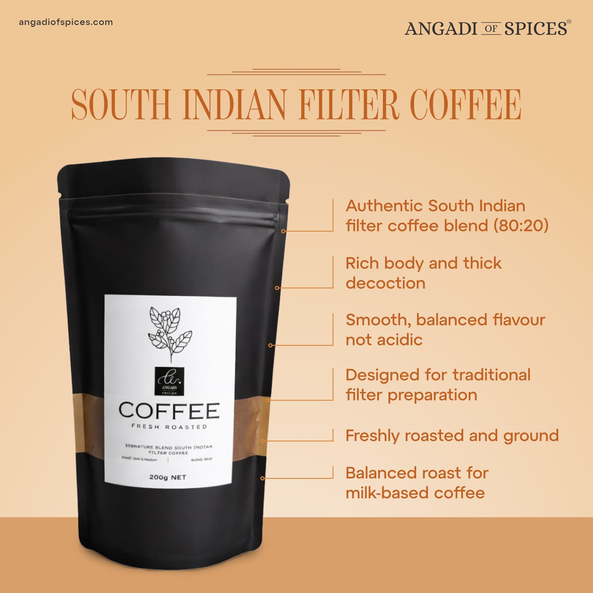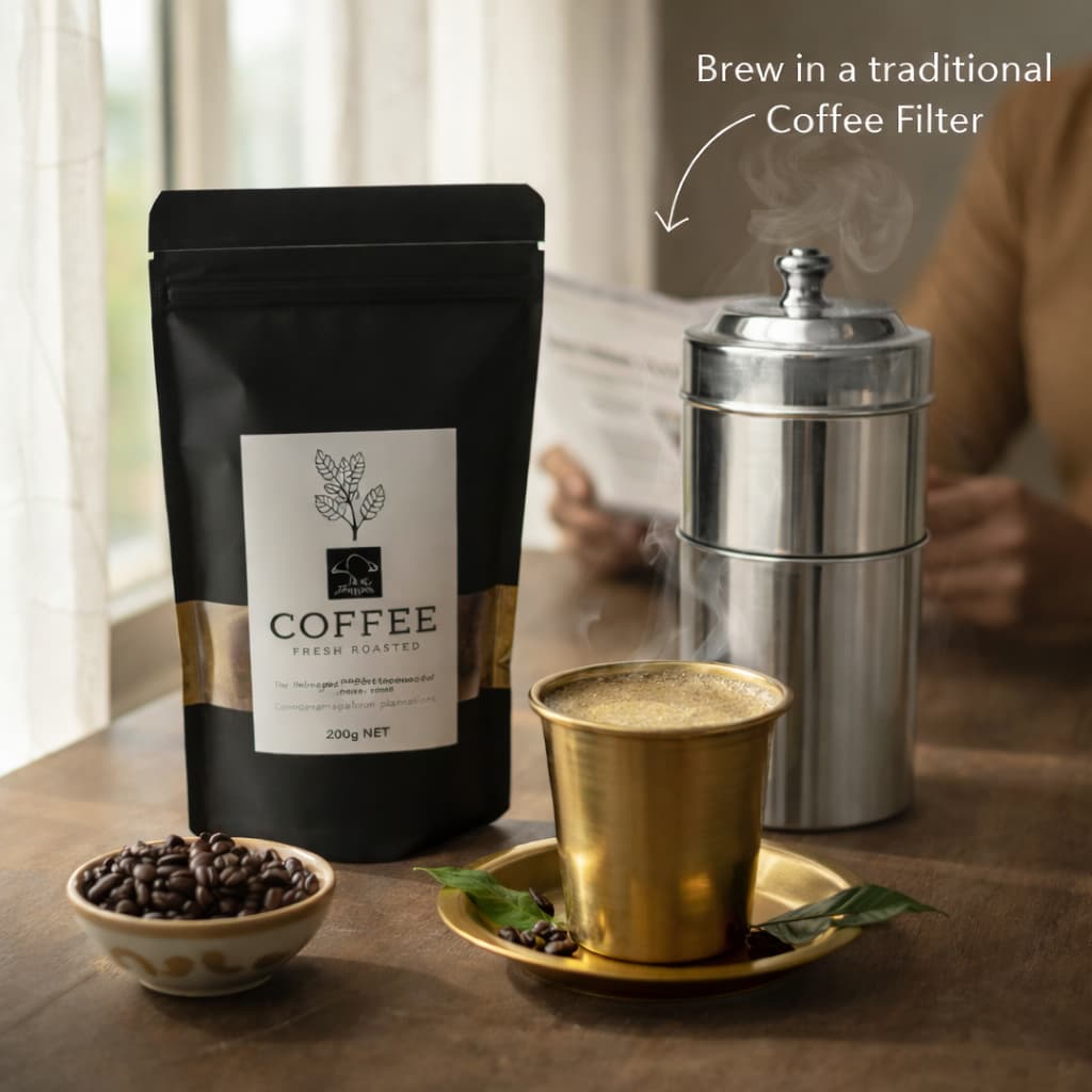 {"type":"doc","content":[{"type":"paragraph","attrs":{"textAlign":null},"content":[{"type":"text","text":"Our "},{"type":"text","marks":[{"type":"bold"}],"text":"South Indian Filter Coffee 80:20 Blend"},{"type":"text","text":" is sourced from "},{"type":"text","marks":[{"type":"bold"}],"text":"Chikkamagaluru plantations"},{"type":"text","text":", a region known for producing some of India’s finest coffee."}]},{"type":"paragraph","attrs":{"textAlign":null},"content":[{"type":"text","text":"Roasted to preserve its natural richness, this blend combines "},{"type":"text","marks":[{"type":"bold"}],"text":"80% premium coffee with 20% chicory"},{"type":"text","text":", creating the deep, full-bodied flavour that defines traditional South Indian filter coffee."}]},{"type":"paragraph","attrs":{"textAlign":null},"content":[{"type":"text","text":"The result is a cup that is "},{"type":"text","marks":[{"type":"bold"}],"text":"bold, aromatic, and naturally smooth"},{"type":"text","text":", delivering the comforting coffee experience cherished across South Indian homes."}]},{"type":"horizontalRule"},{"type":"heading","attrs":{"textAlign":null,"level":3},"content":[{"type":"text","text":"What “80:20” Means"}]},{"type":"paragraph","attrs":{"textAlign":null},"content":[{"type":"text","text":"The classic South Indian brewing ratio:"}]},{"type":"paragraph","attrs":{"textAlign":null},"content":[{"type":"text","marks":[{"type":"bold"}],"text":"80% Coffee"},{"type":"text","text":" – for flavour and aroma"},{"type":"hardBreak"},{"type":"text","marks":[{"type":"bold"}],"text":"20% Chicory"},{"type":"text","text":" – for body and texture"}]},{"type":"paragraph","attrs":{"textAlign":null},"content":[{"type":"text","text":"This balance creates:"}]},{"type":"paragraph","attrs":{"textAlign":null},"content":[{"type":"text","text":"• Stronger brew"},{"type":"hardBreak"},{"type":"text","text":"• Richer body"},{"type":"hardBreak"},{"type":"text","text":"• Smooth texture that blends beautifully with milk"}]},{"type":"horizontalRule"},{"type":"heading","attrs":{"textAlign":null,"level":3},"content":[{"type":"text","text":"Perfect For"}]},{"type":"paragraph","attrs":{"textAlign":null},"content":[{"type":"text","text":"✔ Traditional South Indian filter coffee"},{"type":"hardBreak"},{"type":"text","text":"✔ Strong morning coffee with milk"},{"type":"hardBreak"},{"type":"text","text":"✔ After-meal coffee"},{"type":"hardBreak"},{"type":"text","text":"✔ Serving in brass coffee tumblers"},{"type":"hardBreak"},{"type":"text","text":"✔ Enjoying the aroma of freshly brewed decoction"}]},{"type":"horizontalRule"},{"type":"heading","attrs":{"textAlign":null,"level":3},"content":[{"type":"text","text":"How to Use (Check product images)"}]},{"type":"orderedList","attrs":{"start":1,"type":null},"content":[{"type":"listItem","content":[{"type":"paragraph","attrs":{"textAlign":null},"content":[{"type":"text","text":"Add "},{"type":"text","marks":[{"type":"bold"}],"text":"2–3 teaspoons"},{"type":"text","text":" of coffee powder to the "},{"type":"text","marks":[{"type":"bold"}],"text":"upper chamber of a traditional coffee filter"},{"type":"text","text":"."}]}]},{"type":"listItem","content":[{"type":"paragraph","attrs":{"textAlign":null},"content":[{"type":"text","text":"Pour "},{"type":"text","marks":[{"type":"bold"}],"text":"hot water"},{"type":"text","text":" over the powder."}]}]},{"type":"listItem","content":[{"type":"paragraph","attrs":{"textAlign":null},"content":[{"type":"text","text":"Allow the "},{"type":"text","marks":[{"type":"bold"}],"text":"decoction to slowly drip"},{"type":"text","text":" into the lower chamber."}]}]},{"type":"listItem","content":[{"type":"paragraph","attrs":{"textAlign":null},"content":[{"type":"text","text":"Mix "},{"type":"text","marks":[{"type":"bold"}],"text":"1 part decoction with hot milk"},{"type":"text","text":" and sweeten if desired."}]}]}]},{"type":"horizontalRule"},{"type":"heading","attrs":{"textAlign":null,"level":3},"content":[{"type":"text","text":"Our Promise"}]},{"type":"paragraph","attrs":{"textAlign":null},"content":[{"type":"text","text":"At "},{"type":"text","marks":[{"type":"bold"}],"text":"Angadi of Spices"},{"type":"text","text":", we pack coffee in "},{"type":"text","marks":[{"type":"bold"}],"text":"small batches"},{"type":"text","text":" to preserve freshness and aroma."}]},{"type":"paragraph","attrs":{"textAlign":null},"content":[{"type":"text","text":"No artificial flavouring."},{"type":"hardBreak"},{"type":"text","text":"No additives."}]},{"type":"paragraph","attrs":{"textAlign":null},"content":[{"type":"text","text":"Only "},{"type":"text","marks":[{"type":"bold"}],"text":"classic South Indian Filter Coffee"},{"type":"text","text":", crafted for depth, aroma, and everyday comfort."}]},{"type":"horizontalRule"},{"type":"paragraph","attrs":{"textAlign":null},"content":[{"type":"text","marks":[{"type":"bold"}],"text":"What You’ll Receive:"},{"type":"text","text":" South Indian Filter Coffee 80:20 Blend"},{"type":"hardBreak"},{"type":"text","marks":[{"type":"bold"}],"text":"Ingredients:"},{"type":"text","text":" Coffee (80%), Chicory (20%)"}]}]}